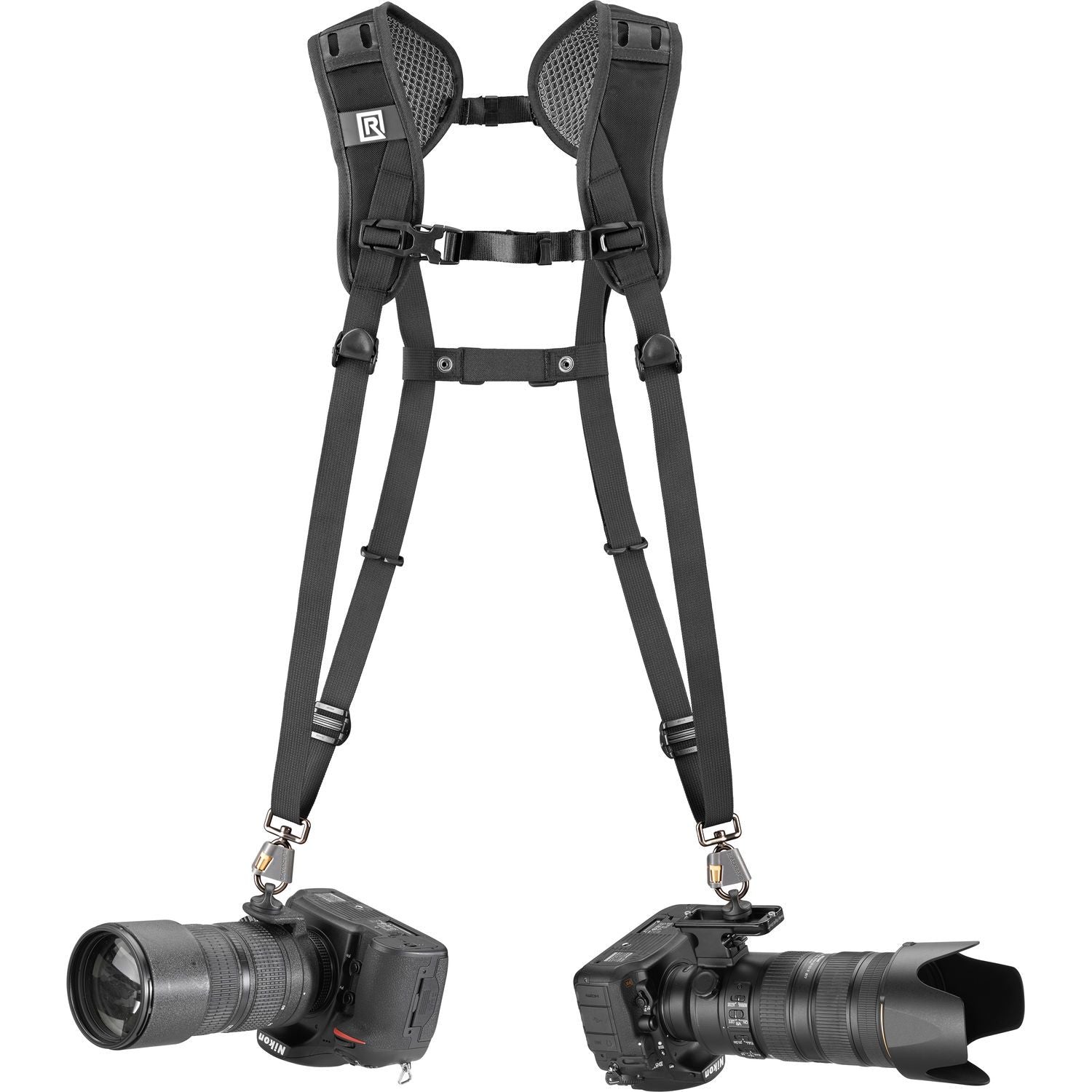 This double shoulder harness from renowned strap makers BlackRapid is ready for a day of running and gunning, with included attachments for two camera bodies and a mid-chest strap for additional equipment. With a design that minimizes neck fatigue and soft, breathable padding, the Double Breathe Harness is a lightweight solution for your heavyweight shooting missions.