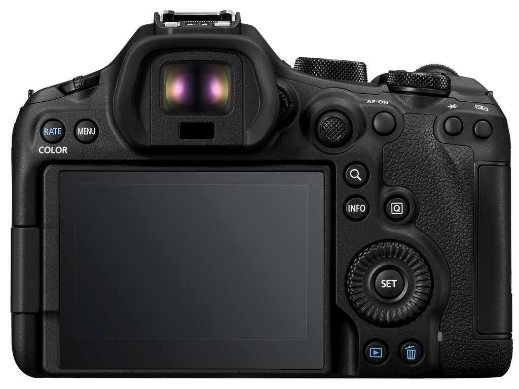 The EOS R6 Mark III camera features a 0.5-inch, 3.69m dot electronic viewfinder (EVF) providing 100% image coverage, 0.76x magnification, and a 23mm eye point ensuring comfortable viewing and accommodation of eyeglasses.