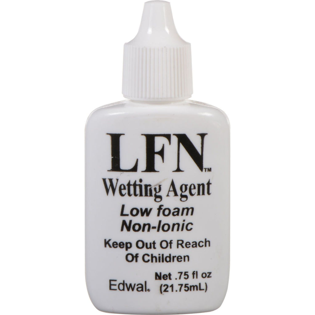 Edwal LFN Wetting Agent is a liquid wetting agent with low foam. In a pint of developer, just two drops of super-low-foaming, non-ionic LFN will stop air bubbles and floaters from creating pinholes. Water stains can be avoided by using just two drops per pint of water when using it as a film rinse. Film that is hanging will drain entirely and uniformly.