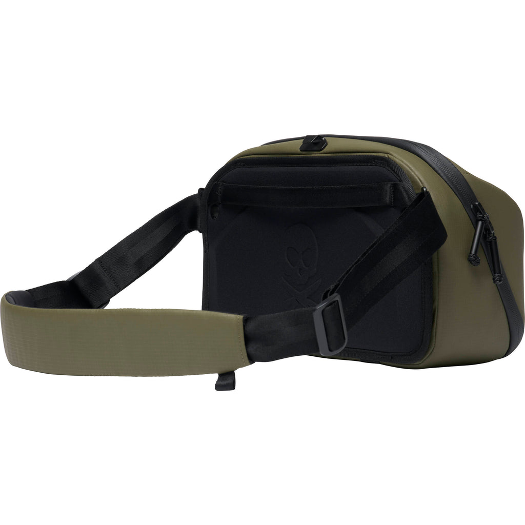 Between the padded strap, and the pivoting shoulder strap to carry how you want (shoulder bag, cross body or sling carry) this sling was designed for maximum comfort. The back of the sling has an EVA foam formed back panel for comfort and air flow. There is a roller luggage pass-thru to give your shoulder a rest while traveling. On the front and bottom of the sling, there are external molle straps if you need to carry more like a tripod or jacket.