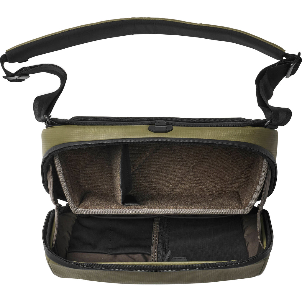 With the same durable and water resistant materials as our McKinnon camera bag 25L, the Sling 8L has enough space to fit a mirrorless or small DSLR with an extra lens comfortably. We built the opening with a rigid wireframe construction for quick access and full visibility. There is a quick-latching system to make accessing your gear with one hand a breeze. On the inside of the door, there is an elastic zippered mesh pocket, and dedicated pockets for memory cards and camera batteries.