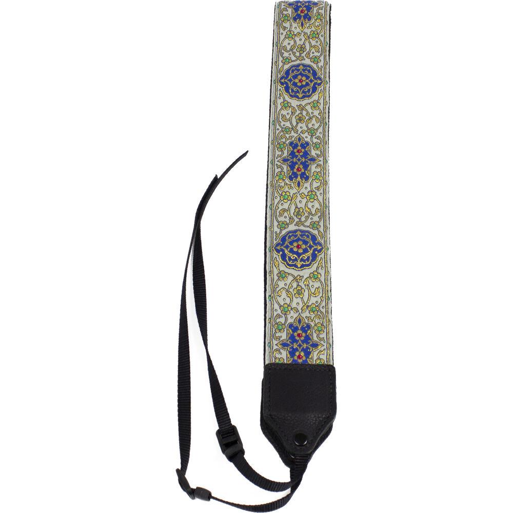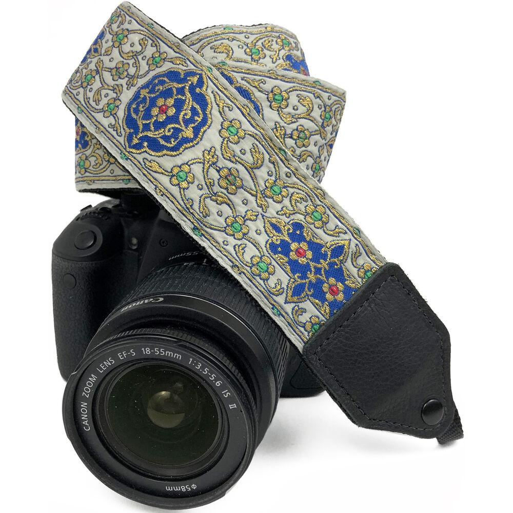 Gold floral trail jacquard camera strap. This camera strap has 2 points of attachment and can easily be connected to your camera.