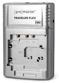 The ProMaster Traveler Flex Lithium-Ion Battery Charger is compact, lightweight, and easy to use: just plug it in and charge your battery. A convenient LED light turns red when your battery is charging and green when charging is complete. True to its name, the Traveler Flex is a great travel solution and has multi-voltage circuitry that accepts 120-240V for worldwide use with the included AC adapter (an outlet adapter is required for use in some countries). The Traveler Flex charges most batteries in two hours or less, and can be positioned flat on a desk or tabletop so that your batteries remain securely in place while charging.