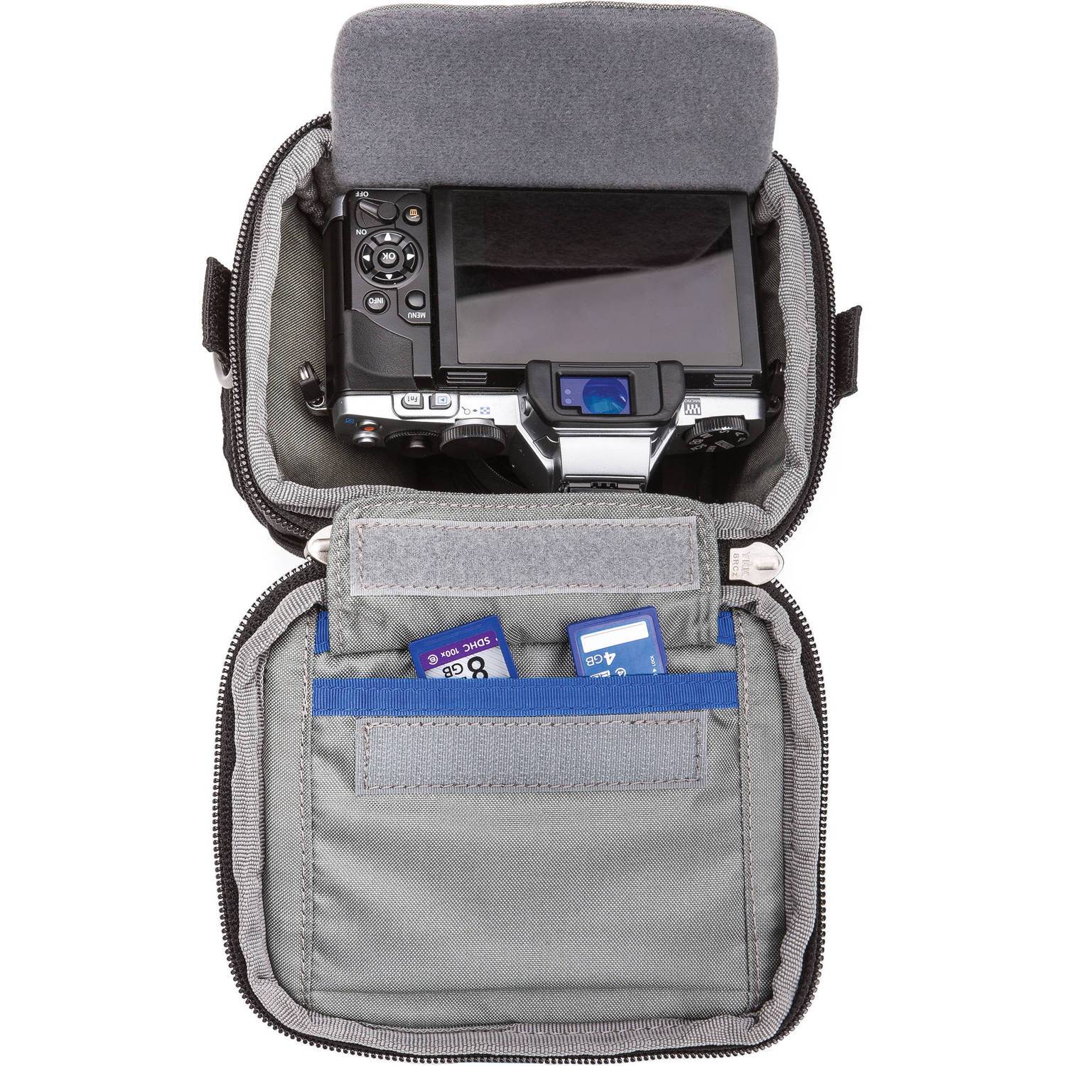 Holds a small to medium size mirrorless body with up to a 3.3" (8.4cm) lens attached Examples: OMD E-M5 with 12-50mm kit lens (hood in position) Fuji X-E2 withl8-55mm kit lens (hood reversed) Sony a6000 with 16-50mm kit lens (hood in position) |