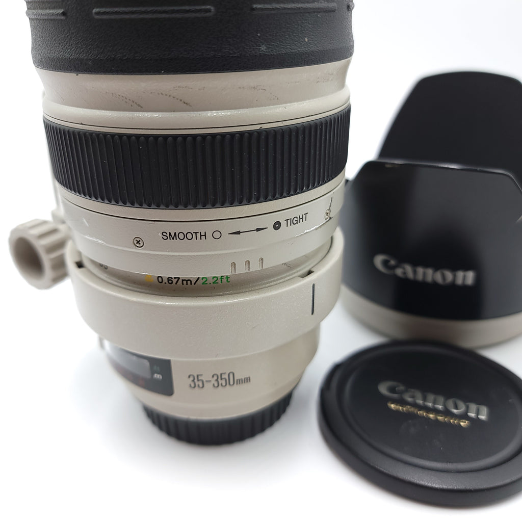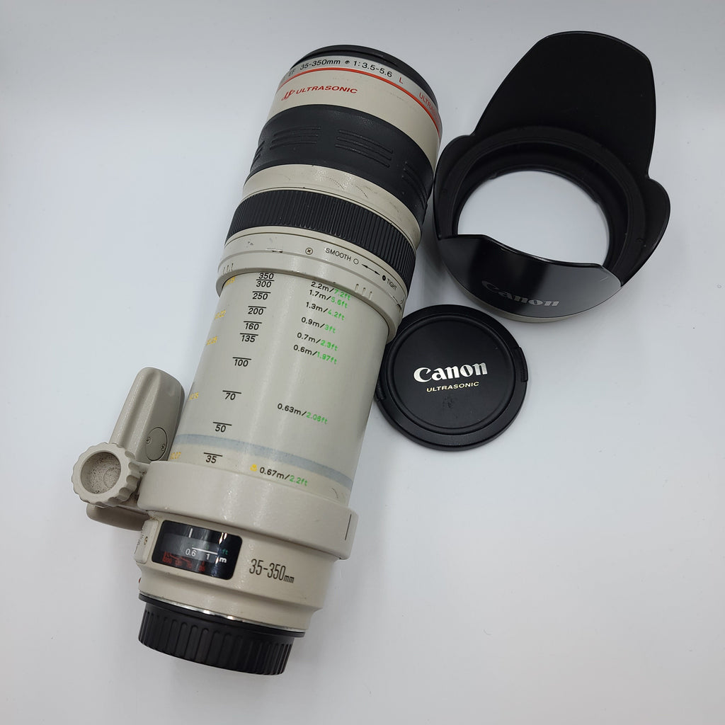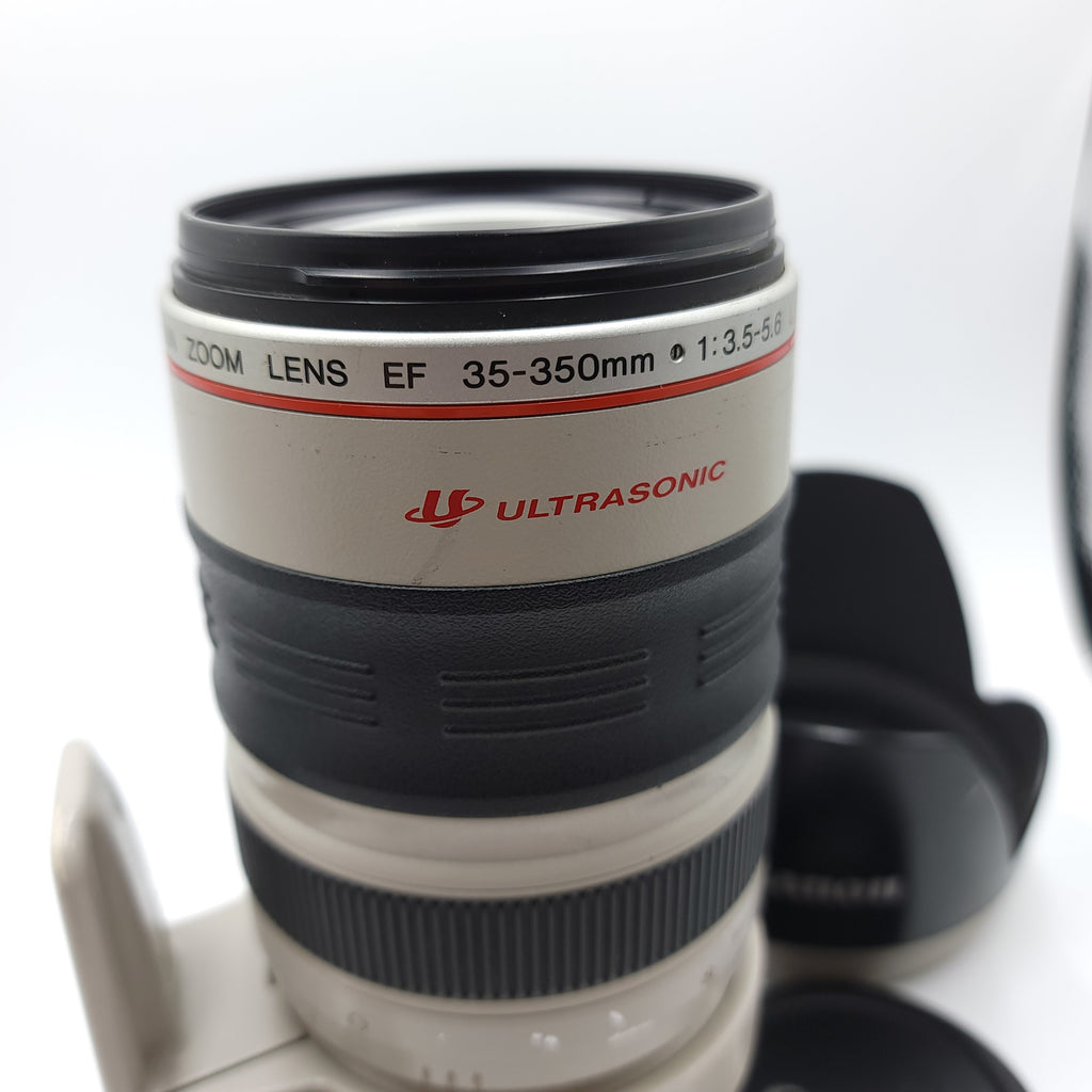 This Used Canon 35-350mm f3.5-5.6L Lens is in Excellent condition and includes Front Cap, Hood, Lens Case, Rear Cap, Strap and a 100 day warranty. Item pictured is the actual item for sale. Note: Some wear on the barrel. Slight haze on inside front element.