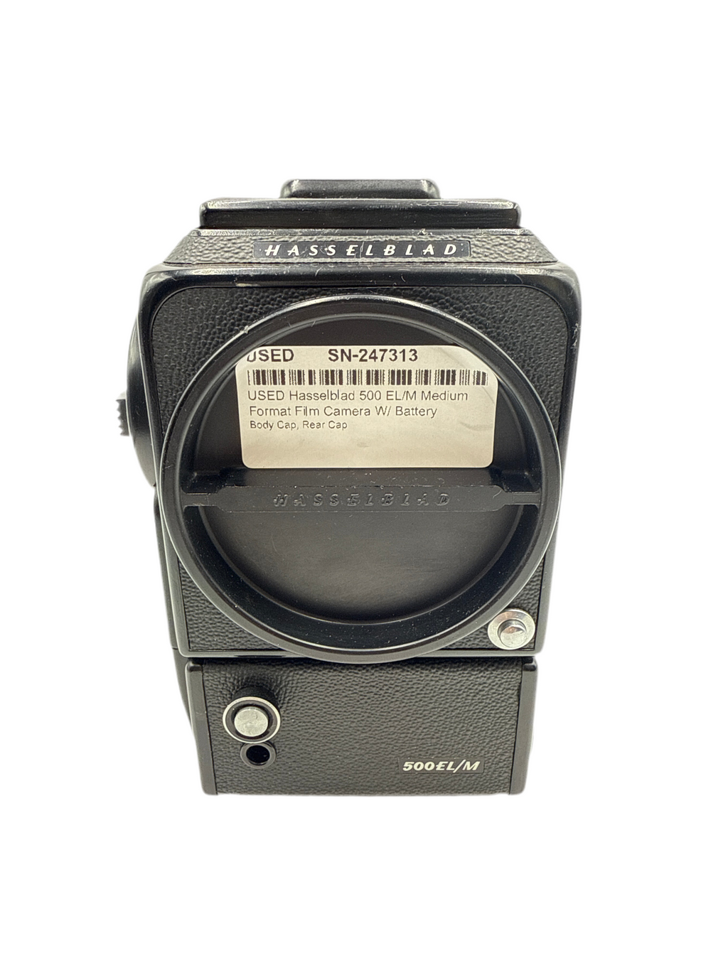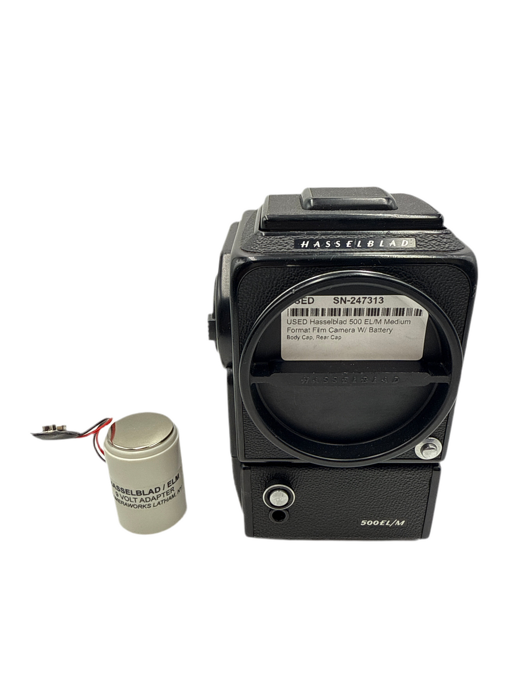 This USED Hasselblad 500 EL/M Medium Format Film Camera W/ Battery Adapter is in Excellent condition and includes Body Cap, Rear Cap and a 100 day warranty. Item pictured is the actual item for sale. Note: Comes W/ Camera Works 9V Battery Adapter