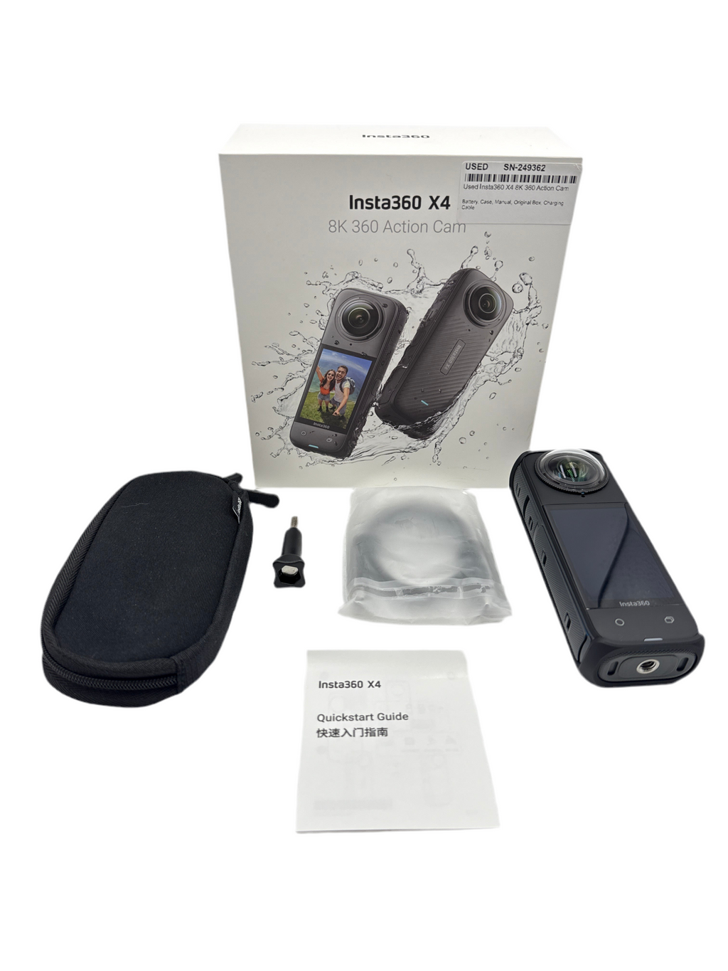 This Used Insta360 X4 8K 360 Action Cam is in Mint condition and includes Battery, Case, Manual, Original Box, Charging Cable and a 100 day warranty. Item pictured is the actual item for sale.