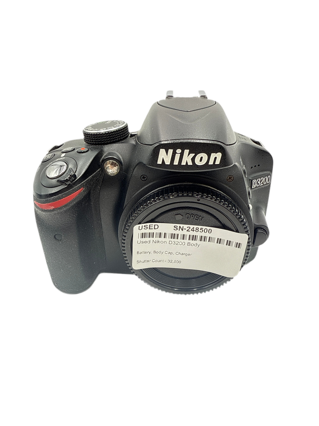 This Used Nikon D3200 Body is in Excellent condition and includes Battery, Body Cap, Charger and a 100 day warranty. The camera has a shutter count of 32,500. Item pictured is the actual item for sale.