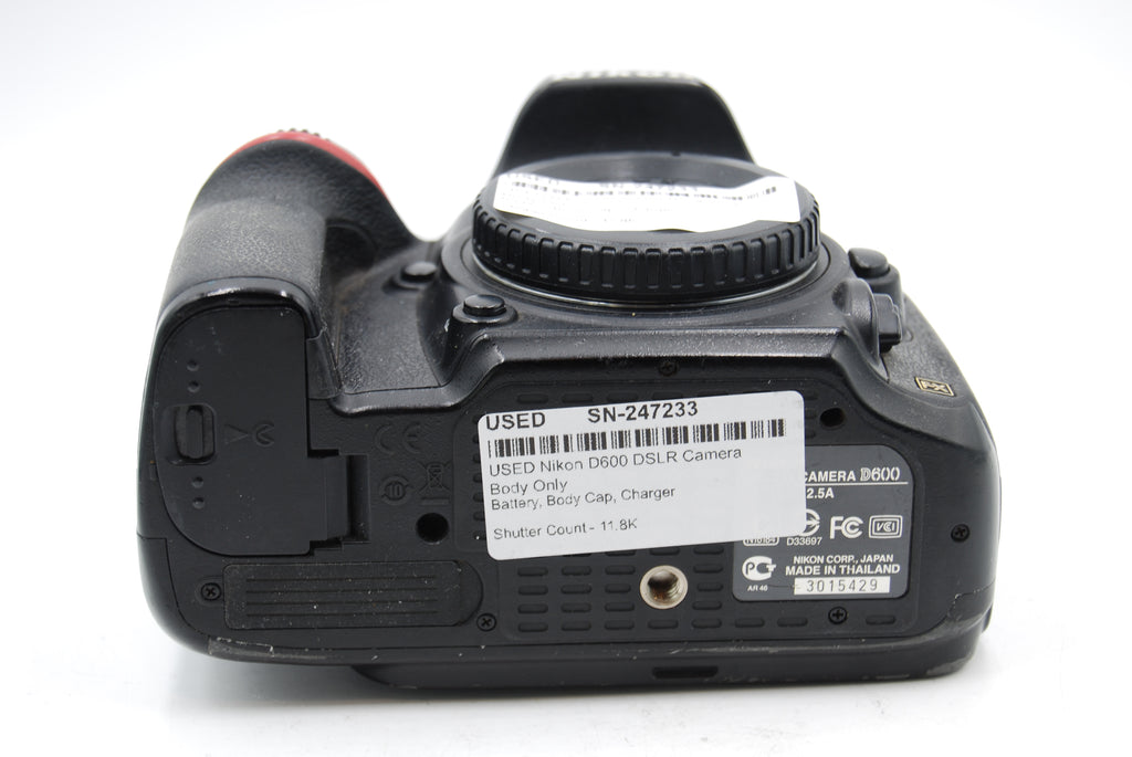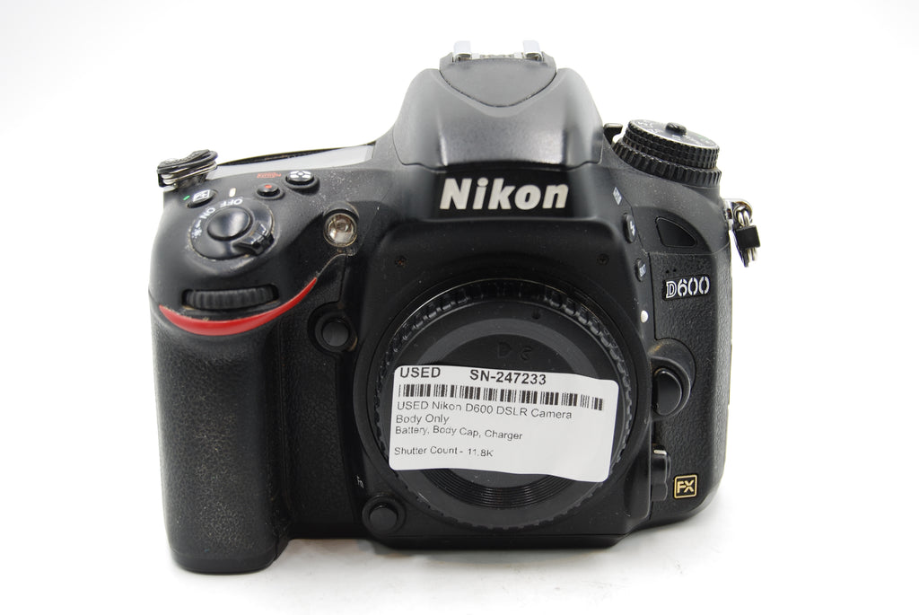 This USED Nikon D600 DSLR Camera Body Only is in Good condition and includes Battery, Body Cap, Charger and a 100 day warranty. The camera has a shutter count of 11.8K. Item pictured is the actual item for sale.