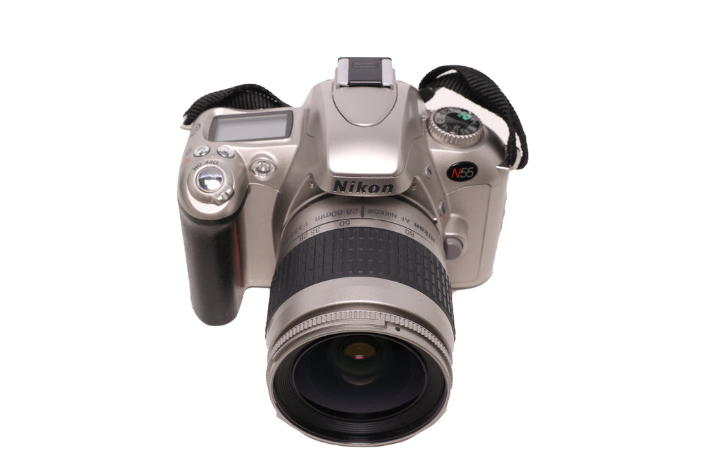 This USED Nikon N55 w/ 28-80mm f3.3-5.6 G is in Excellent condition and includes Strap and a 100 day warranty. Item pictured is the actual item for sale.
