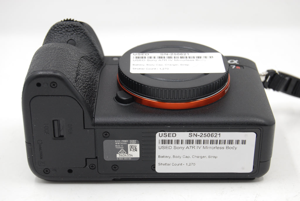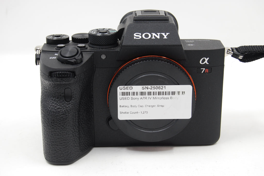 This USED Sony A7R IV Mirrorless Body is in Excellent+ condition and includes Battery, Body Cap, Charger, Strap and a 100 day warranty. The camera has a shutter count of 1,270. Item pictured is the actual item for sale.